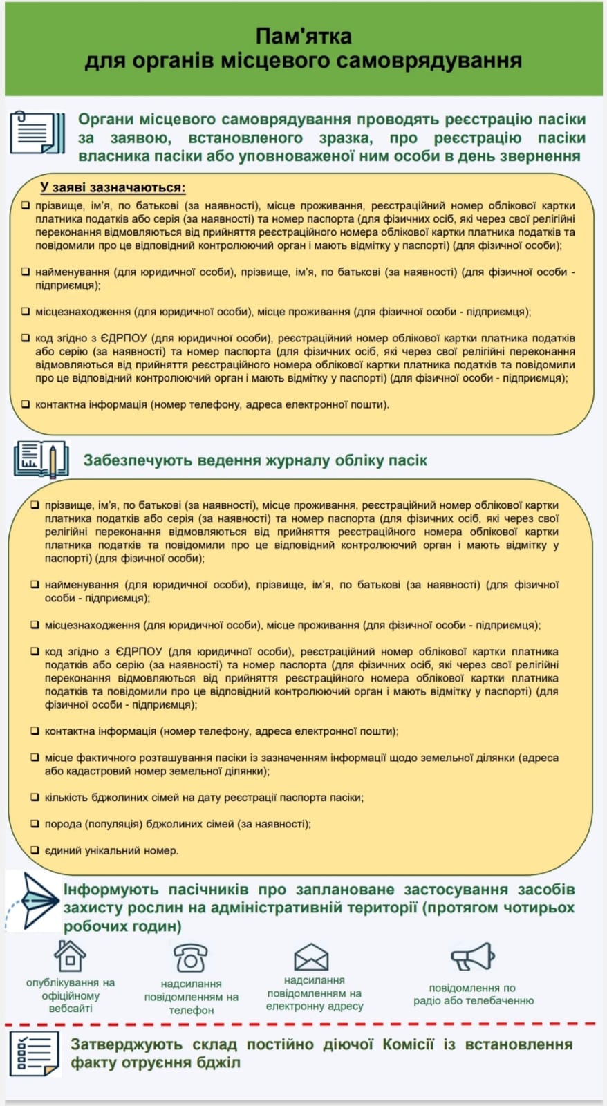 Для профілактики цього та уникнення непорозумінь між аграріями та бджолярами розроблено практичні рекомендації для учасників процесу: аграріїв, пасічників, органів місцевого самоврядування, фізичних осіб та суб’єктів господарювання, які використовують засоби захисту рослин