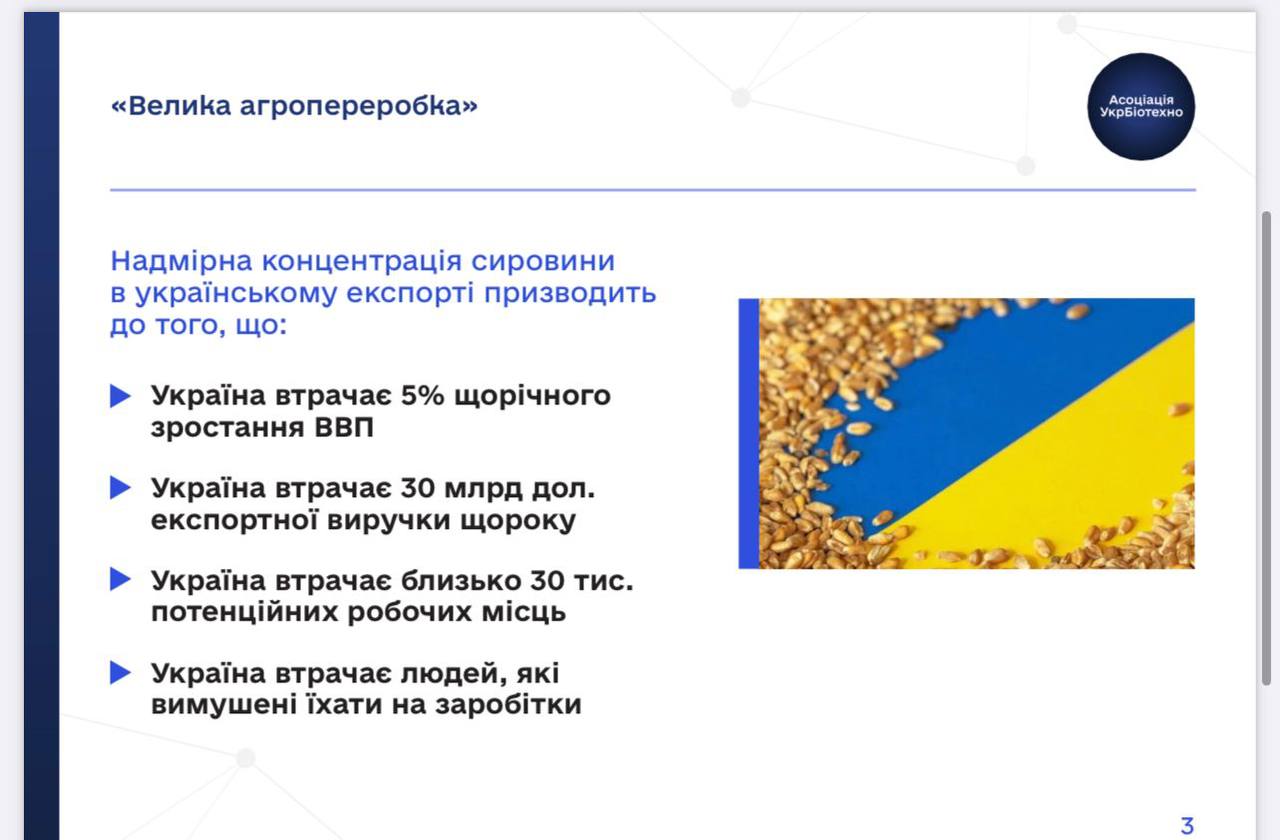 Разом з тим він додав, що восени минулого року в Україні було створено «Українську Асоціацію промислових біотехнологій», мета якої до 2030 року забезпечити, щоб 50% агросировини перероблялося в Україні. За розрахунками асоціації, в Україні можна створити понад 30 заводів біопереробки у різних регіонах.